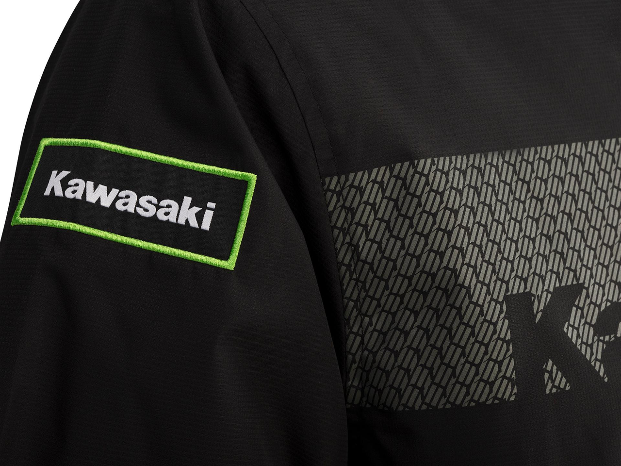 Besonders praktisch sind die grüne Fronttasche mit Reißverschluss sowie eine Innentasche, in der persönliche Gegenstände sicher verstaut werden können. Der gedruckte Kawasaki Schriftzug auf der Brust und im unteren Rückenbereich sorgt für einen sportlich-markanten Auftritt.